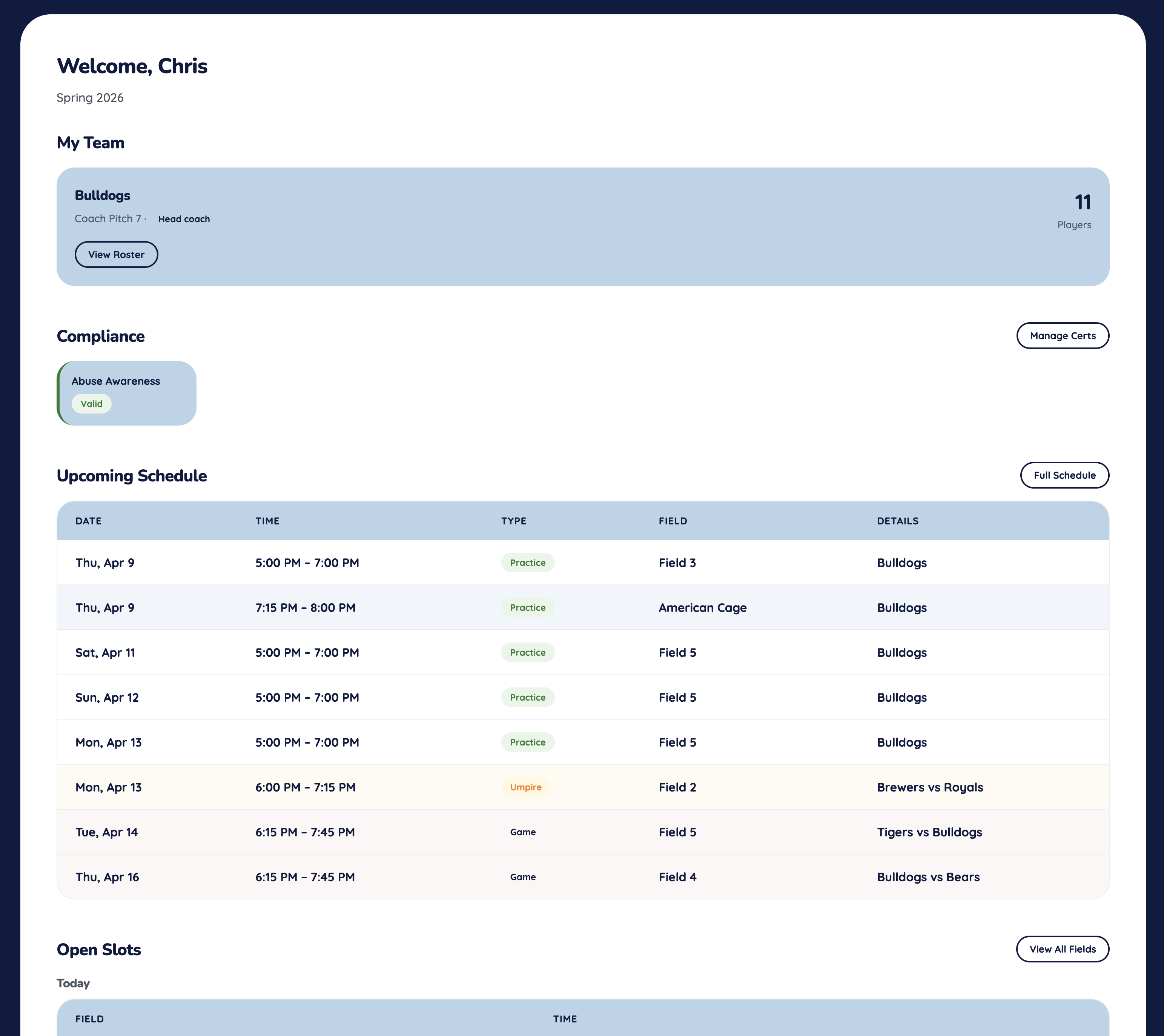 One home screen with your team, certifications, schedule, and open field slots — everything a coach checks before practice.