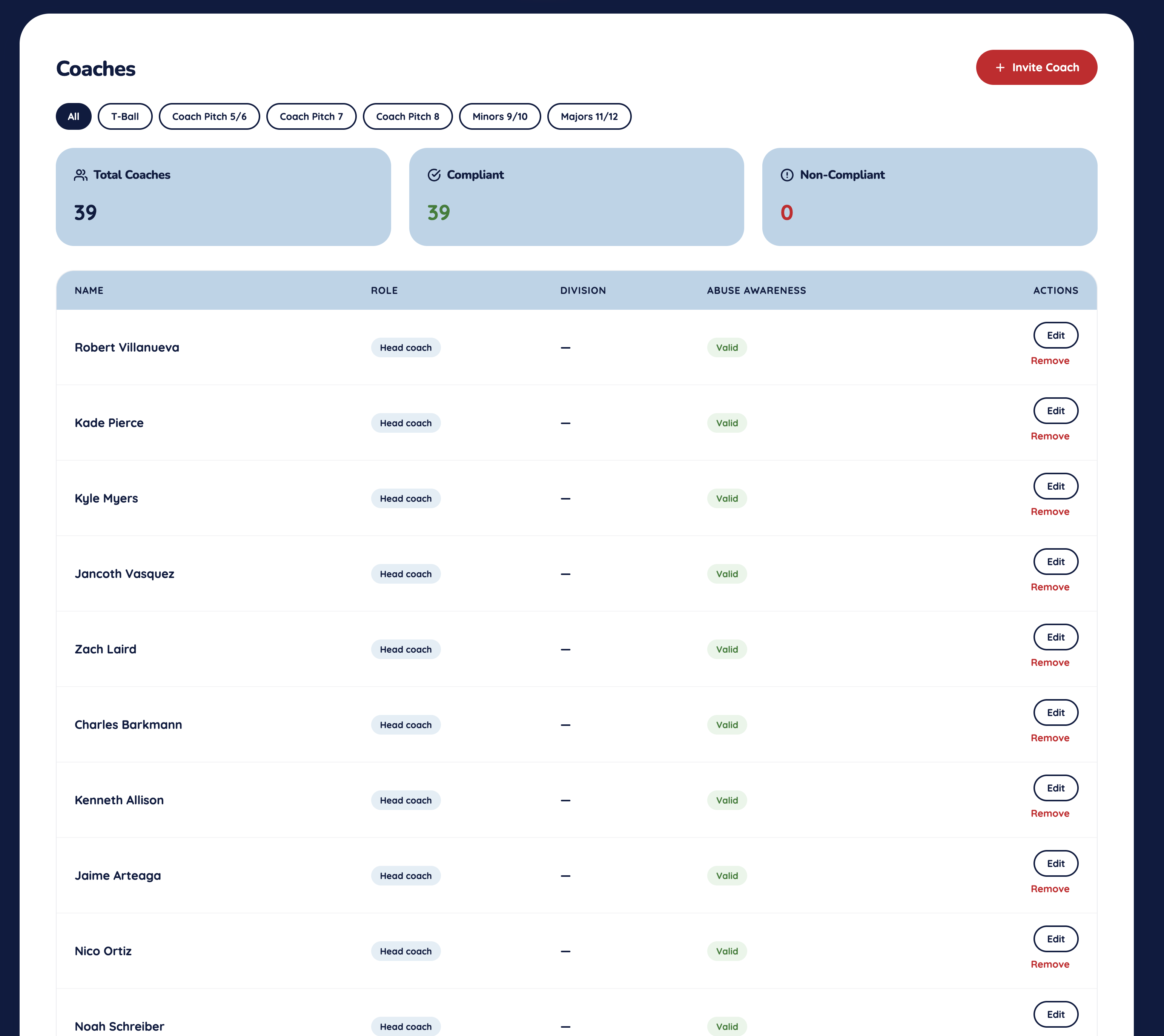 League admins see every coach, every required certification, and every expiration date at a glance — so nobody steps on the field out of compliance.