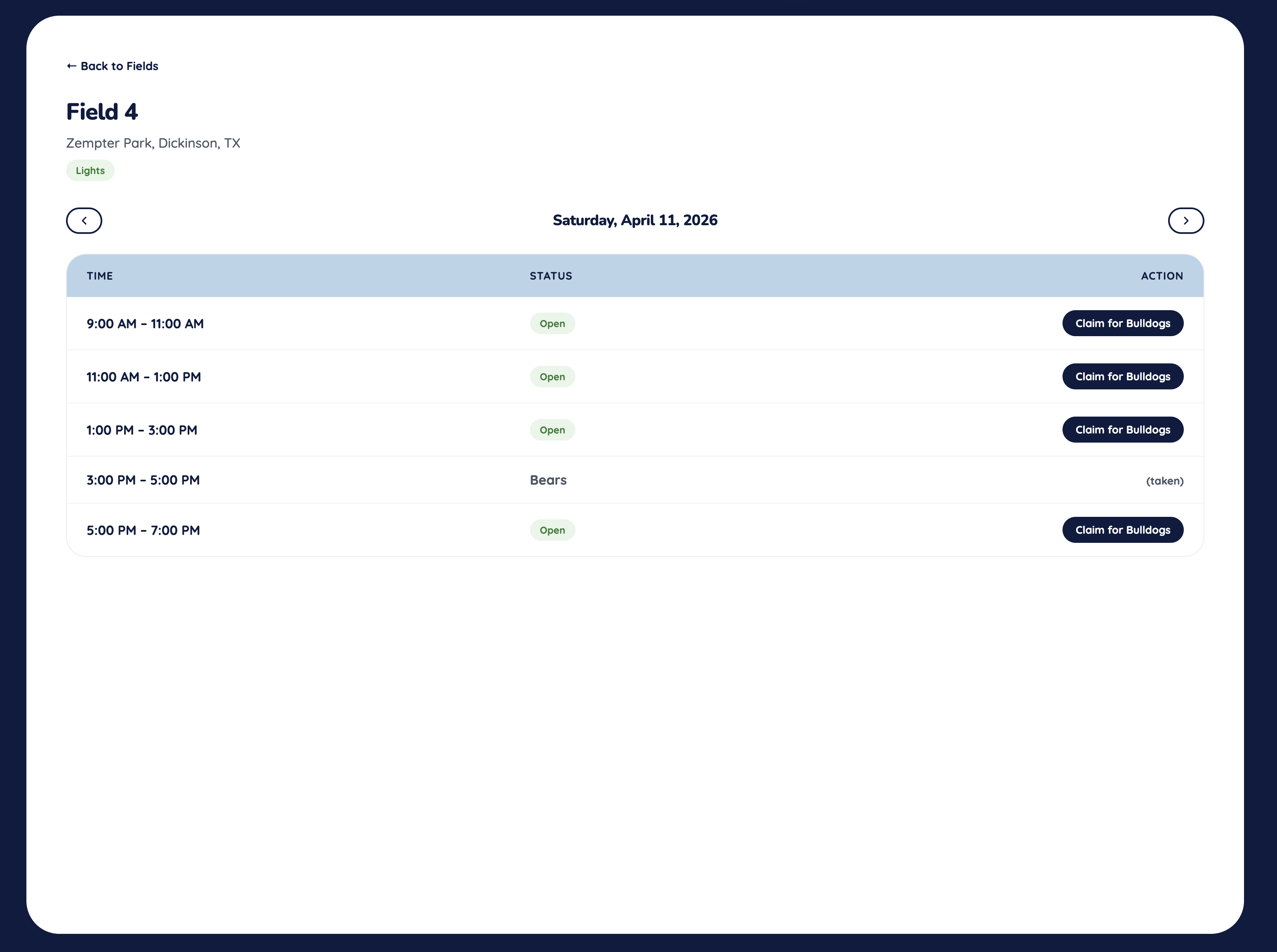 Always current. Calendars, day views, and field slot management built in.