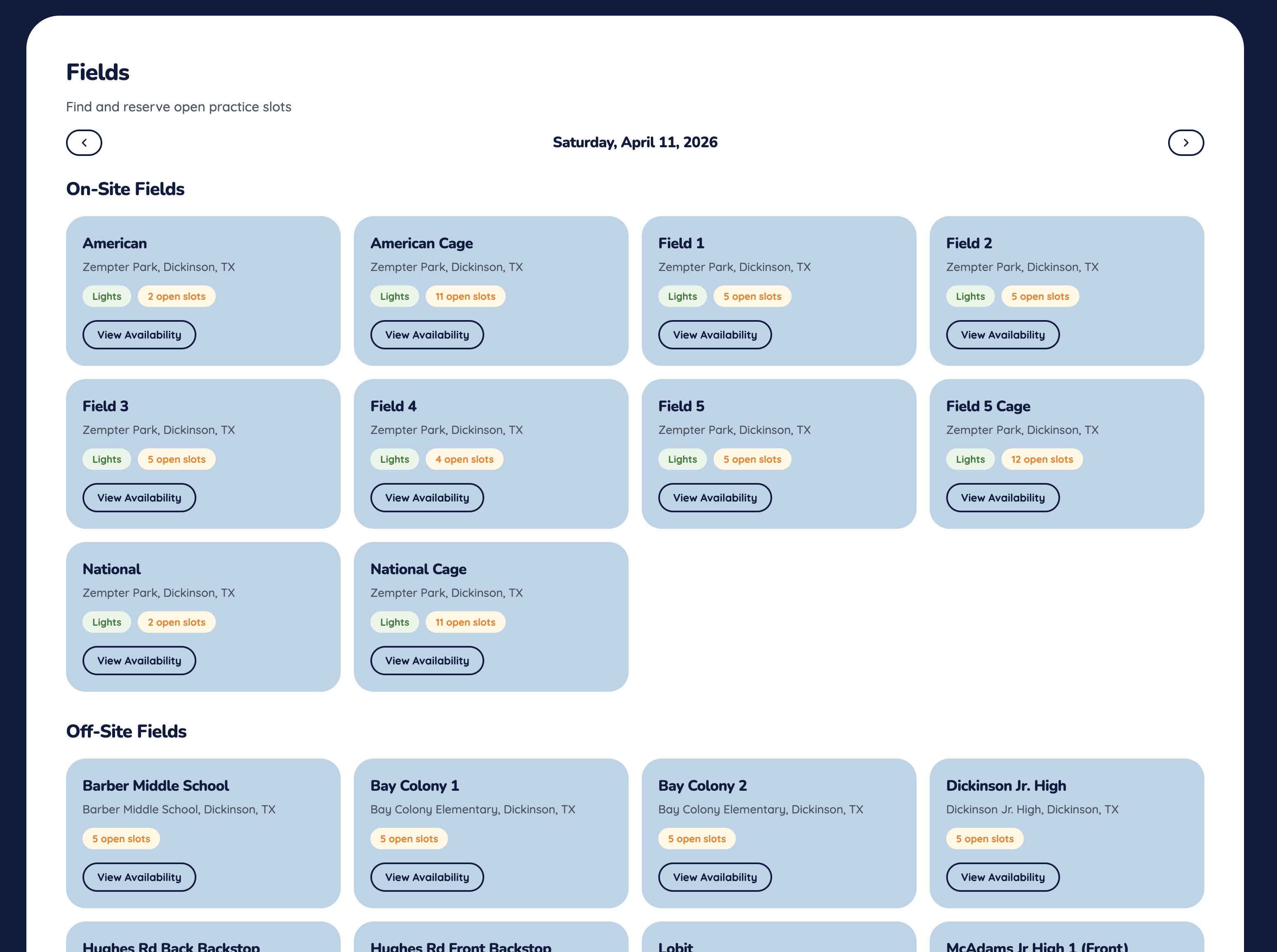 Browse open practice slots across every diamond, filter by lights and date, and claim one in a tap.