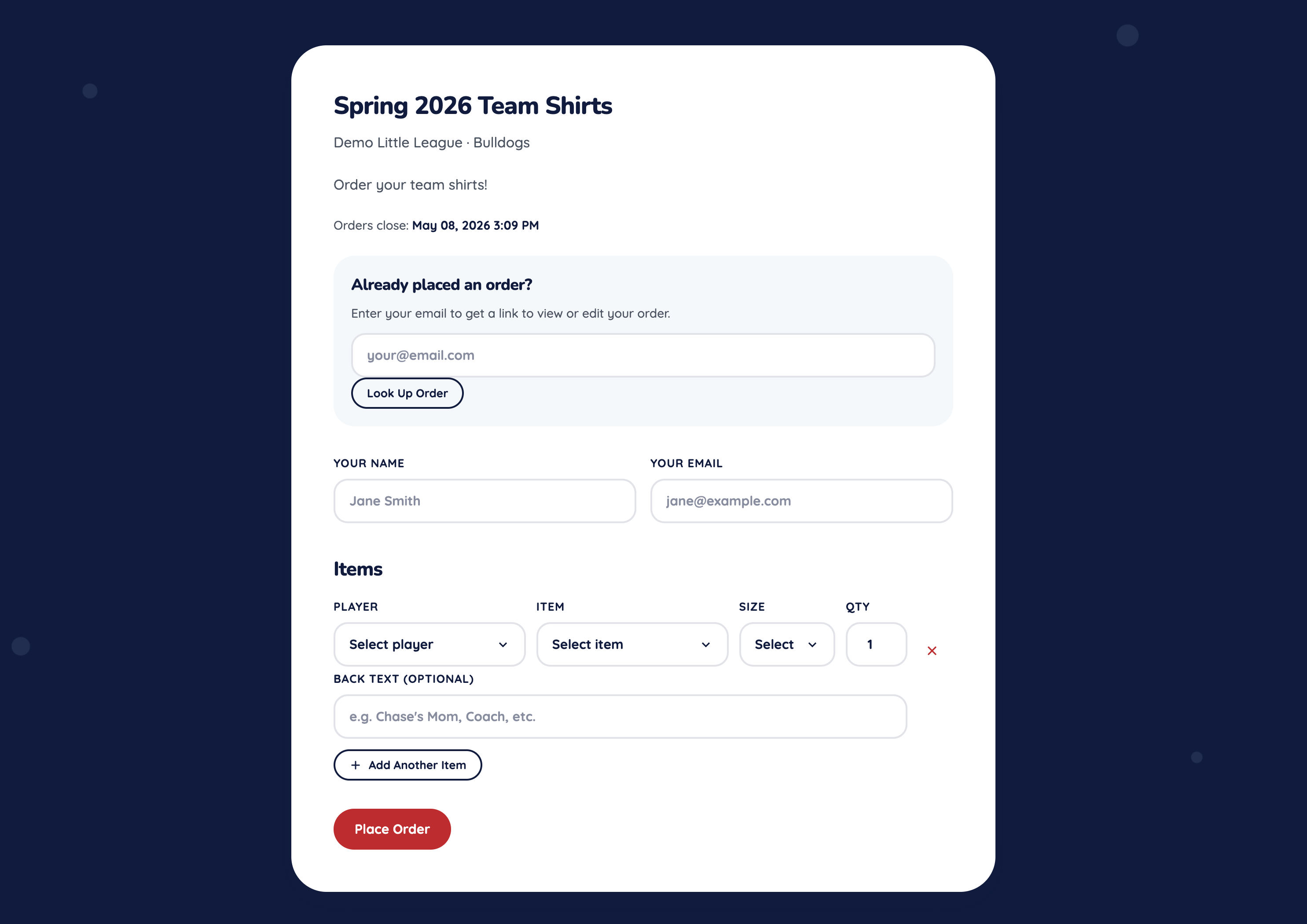 Parents order jerseys through a shareable team link. Coaches see every order, size, and name on one screen.