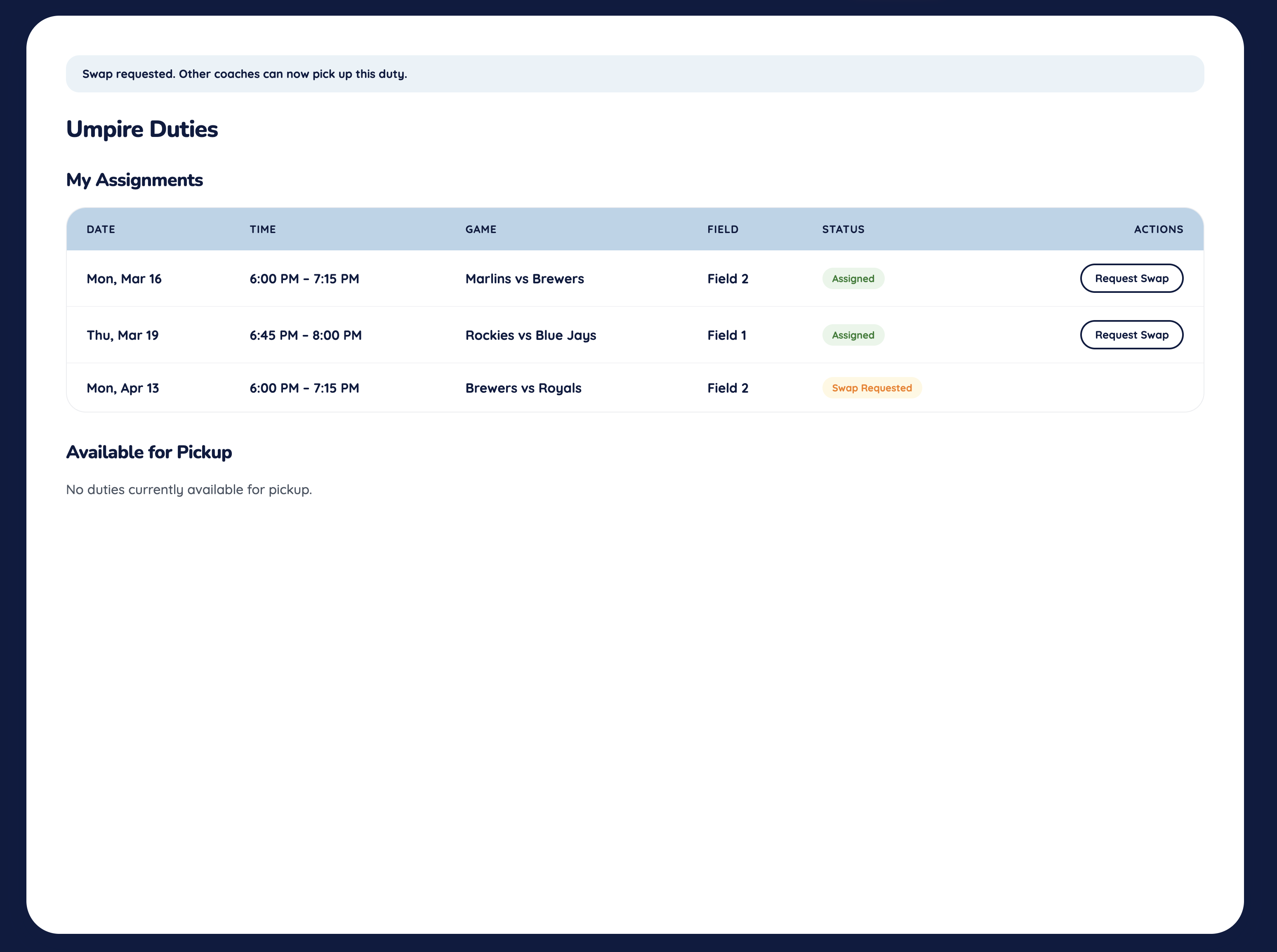 Fair-rotation assignments with a built-in swap marketplace — coaches cover each other without a group text.